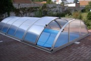 Pod elegantním tvarem velmi nízké konstrukce bazénového zastřešení se skrývá nové technologické řešení. VIVA nabízí kombinaci nejžádanějšího požadavku zákazníků s precizním zpracováním. Hlavní výhodou je jedna pojízdná kolejnice na jedné straně krytu. Druhá strana má pouze pojezdová kolečka, která jezdí po zadlážděném povrchu. Výhodou je velmi snadný pohyb zastřešení a standardní zasklení průhledným PLEXI tl. 4mm. Nosná konstrukce, vzhledem k malé výšce zastřešení, je zhotovena z masivních profilů o rozměru 60 x 63mm. Díky nim dosahujeme vysoké pevnosti jednotlivých segmentů a tím i snadného posuvu. Na výběr máte, jako u každého našeho typu zastřešení, pět barevných odstínů hliníkových profilů.